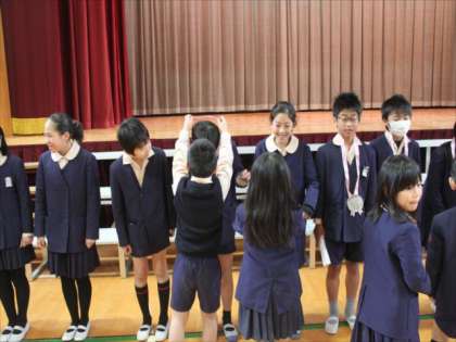 1年生が作ったメダルが卒業生にプレゼントされました。くだもの班や学校行事でいろいろお世話になった6年生のお兄さんお姉さんともお別れです。