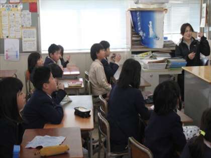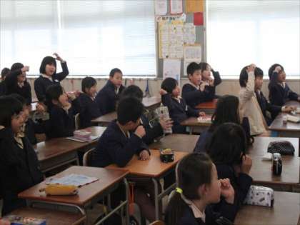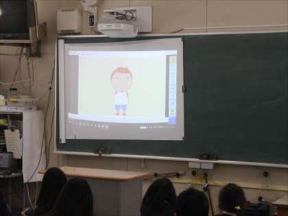 3年のイングリッシュタイム です。DVDで男の子が朝起きてから、両親と話したり、顔緒を洗って寝ぐせの髪の毛を整えるまでのアニメに合わせて発語しています。