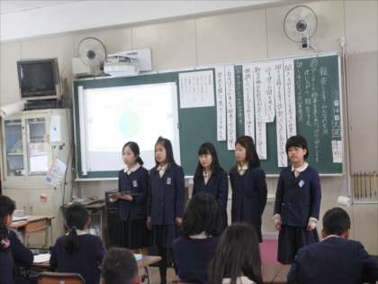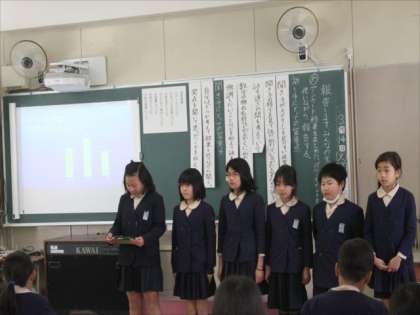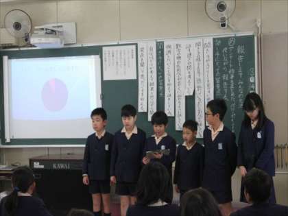 4年生で研究授業がありました。「報告します、みんなの生活」という題で、調べてわかったことと考えたことを、すじ道を立てて報告する。資料を使ってわかりやすく話すことをめあてに学習しました。