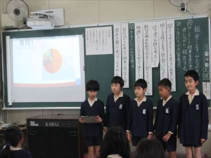 1.ゲームについて2.寝ている時間について3.食生活について4.休日よくいく場所について5.読書について6.休日について7.休み時間について の7項目について班ごとに学級アンケートをつくり結果をまとめました。タブレットでグラフを使ったプレゼン資料を作成しました。