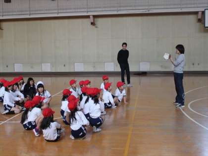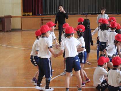 2年生が、体育をしていました。先生がタンバリンを鳴らした回数の数の人数で、グループを作るゲームをしていました。2人はまだいいのですが、6人8人になってくると難しかったみたいです。
