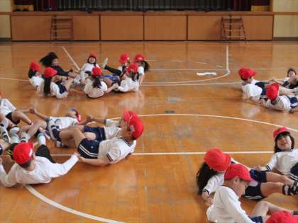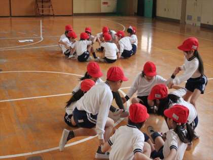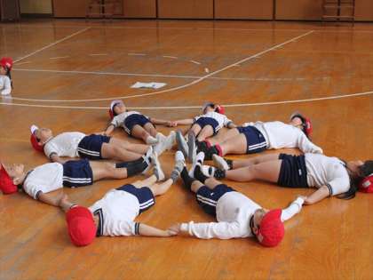 今度は、8人ぐらいのグループで、手をつないで力やタイミングを合わせて、あおむけになる、立ち上がるなどの動きをしました。気持ちをそろえることができたでしょうか?