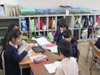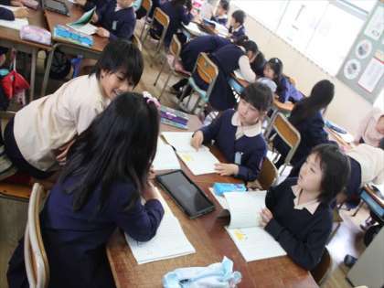 3年生が、国語で「すいせんのラッパ」というお話の学習をしていました。タブレットを使って、音読の動画を撮影して練習をしていました。