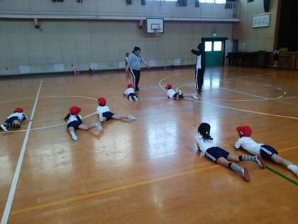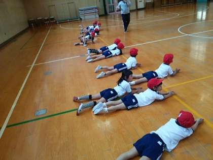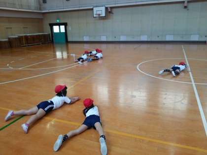 1−2が、講堂で体育をしていました。色々なものになって、動きづくりをしました。たとえば、へびになって動くと動きのスピードが違ってきます。動きの速いへびになっている子から、どうして速いのかを聞くと、手や体の使い方のこつがありました。みんなでやってみました。こうして、動きの種類が増えたり、高まったりしていくのです。