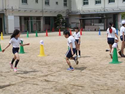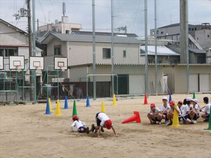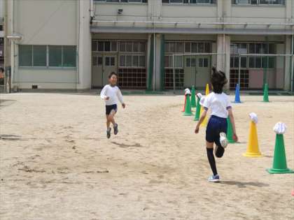 4年生が、体育で徒競走をしていました。うつぶせの姿勢から、笛の合図でスタートします。半周ほどまわって、どちらが速くゴールにたどりつくかを競走します。