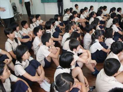 小話は、一番短い小話「あのよー」とか「はとがなんかおとしていったで」「ふーん」とか200ぐらいあるネタから教えていただきました。最後はたぬきがさいころにばける「たぬさい」という落語を聞かせていただきました。聞くときは聞く、答えるときは元気に答える、梅南津守の子どもたちの落語体験学習は、たくさんの笑いに包まれた楽しい時間でした。