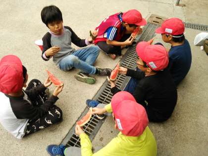 すすのついた鍋や飯ごうをピカピカにするまで、厳しいチェックを受けて、合格者のみが遊べる。規則です。そして、今、スイカを食べています。