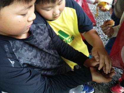 カートンドッグを木の上に持って行って、仲間と食べる野性派もいました。イモリを発見した子もいました。