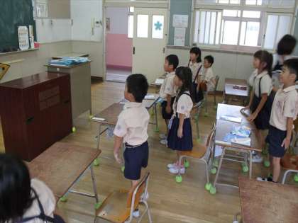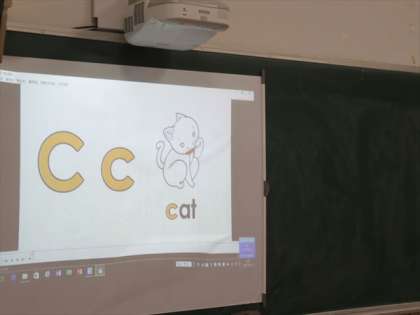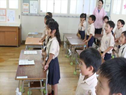 梅南津守小学校では、そうじのあとの15分をイングリッシュタイムを週2回、ぐんぐんタイムを週2回実施しています。1の2の子どもたちも、「英語の時間が楽しい!」とにこにこと取り組んでいます。