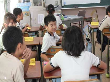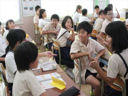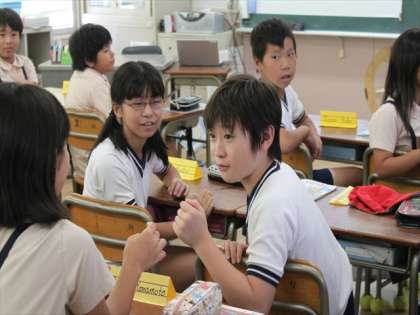 など、4つの文をできるだけすばやく伝えて2人で会話の練習をします。なかなかやります。