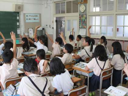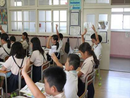5年生が「工業の学習」をしています。工業生産物について調べています。6年生と同じく連日の運動会の練習で疲れているはずの5年生も元気いっぱいです。