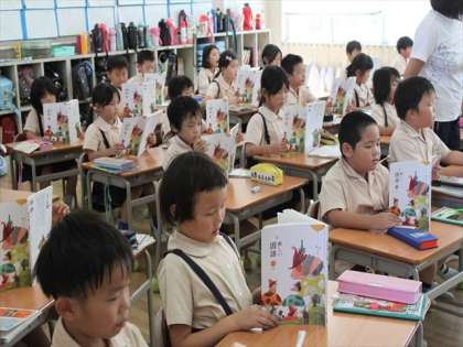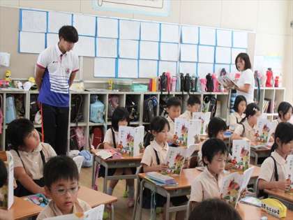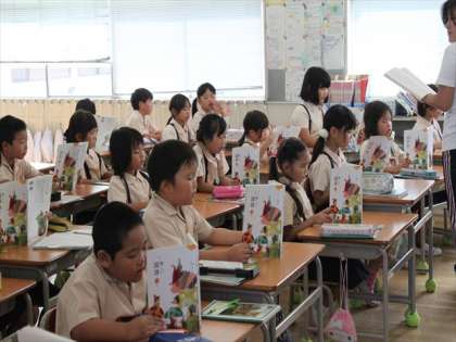 2−1には、教育実習の先生が先生になるための勉強をしています。国語で「名前を見てちょうだい 」の新しい学習が始まりました。どの子も姿勢がよくしっかり学習をしています。