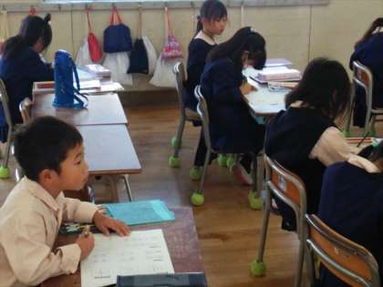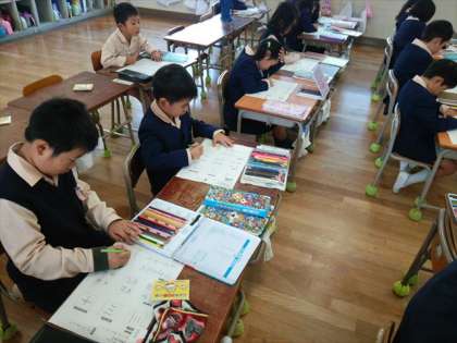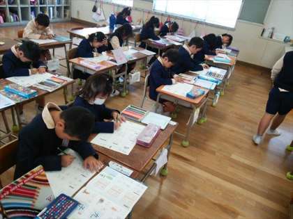 1−1が、とても静かに集中して書写の学習をしています。「右」「左」「力」「九」など書き順によって字の形がかわってしまう漢字があります。気をつけて書いています。