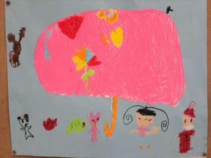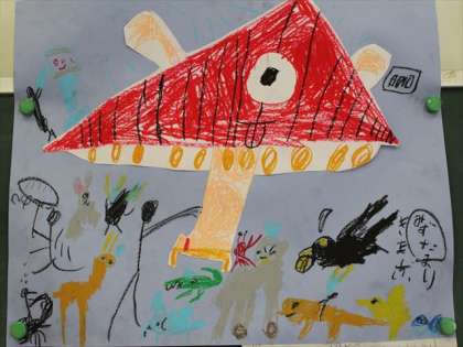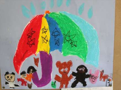 かさに、入ってくる動物たちやかさのいろにも、こどもたちの思いがあります。