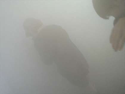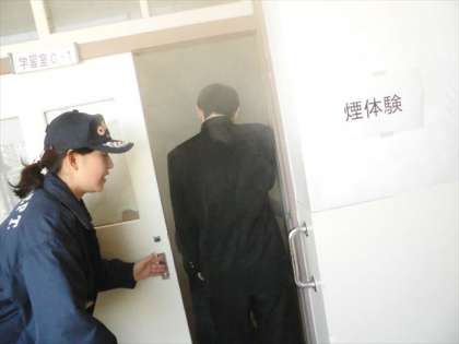 写真は、煙体験の様子です。有害な煙は使用していません。煙の中を避難する時は前が見えなくなるので、「壁伝いに逃げる」「下の方は煙が薄いので、できるだけ姿勢を低くする」などのことを教えていただきました。