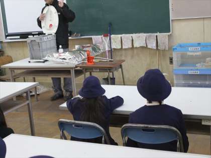 写真は、学校などの施設に災害に備えて備蓄してある物の説明です。簡易トイレは、組み立て式の箱の上に便座を置き中に吸収材をセットします。そのほか救助機材なども置かれています。
