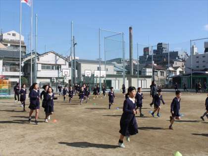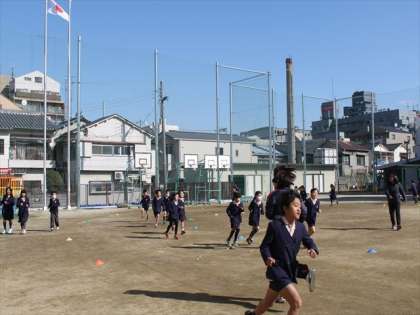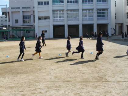 5年生はトラックの外側を、2年生は内側を、同じペースで走ることを目標にしていました。