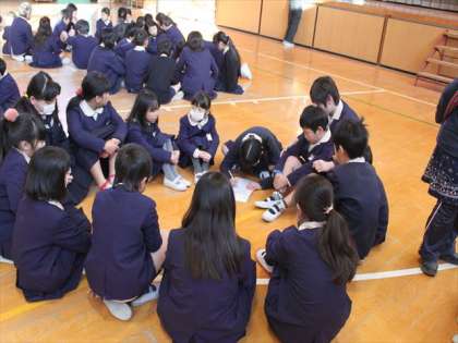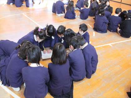 今朝の児童集会は、文房具ビンゴでした。たてわり班(レストラン班)で相談して、文房具を記入していきました。