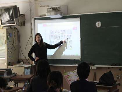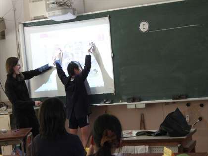 次に、動作を表す文 例えば I play soccer.などを発語しました。そして、文にあった動作の絵を押さえるというゲームをしました。それぞれのペアは指で教科書の絵を抑えるのですが、ボランティアで説明に前に出た児童は両手が足りなくなって、頭で押さえるお笑い?サービスをしてくれました。(Thank you!です)