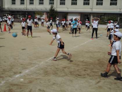 1チームに1年〜6年までいるので、高学年は低学年を狙う時は利き手ではない手を使います。右利きの子は左手で投げます。