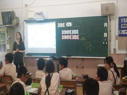 メリンダ先生とエバタ先生の英語の授業です。今日はCan you 〜?Yes,I can. No.I can’t. でした。 メリンダ先生とエバタ先生のやりとりを聞いて耳を慣らしました。サッカー、料理、バスケットボールなどを使って友だちとやりとりしながら、発語していきました。