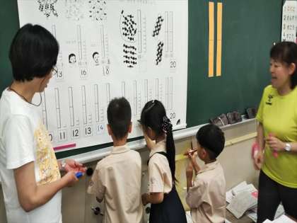 1年生が、「かずをかぞえましょう」というめあてで、学習していました。算数のブロックを使って、10のかたまりに、いくつかブロックをつけくわえた数を数えて声に出したり、数字をかいたりしました。
