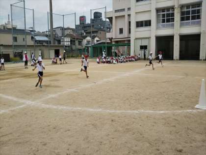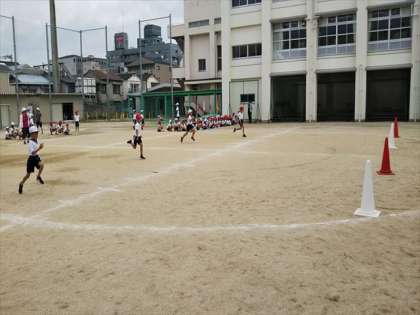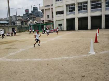 今日はかけっこです。まっすぐ走って、コーンをまわって帰ってきます。