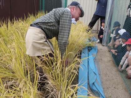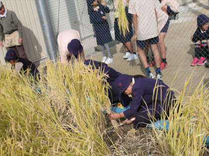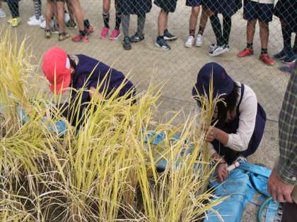 5年生が総合的な学習で5月から取り組んでいる米作りが、いよいよ稲刈りを迎えました。
