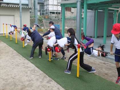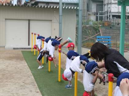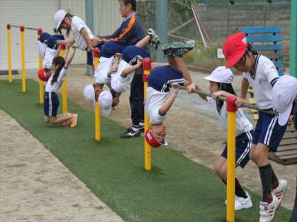 1年生が体育で「てつぼうあそび」をしていました。鉄棒にぶら下がって、回るのですが。、あまり経験のない子もいて、逆さ感覚(頭が鉄棒の下になる)が、慣れていなかったり、おもしろかったりです。