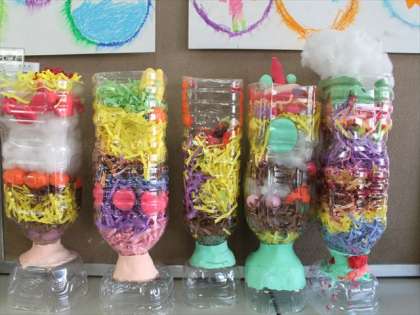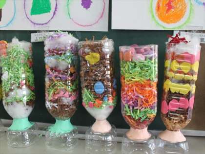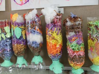 先日ご紹介した1年生の図工「たべたいぱふぇ」が完成しました。