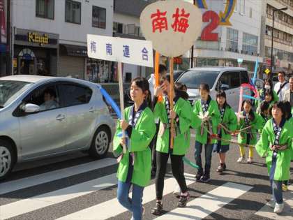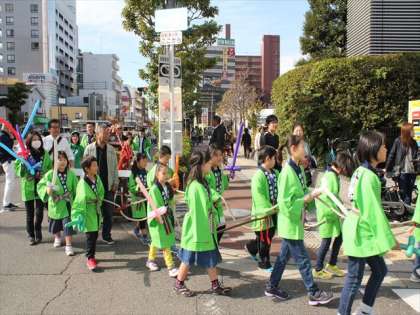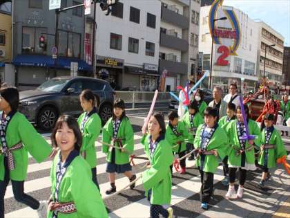 青いはっぴは津守地区、みどりのはっぴは梅南地区ですが、梅南津守小の児童がなかよく力を合わせて、山車(だし)を引き、太鼓を打ちました。