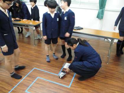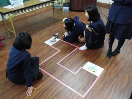 ドラマの下町ロケットにでてくる無人カーのようなロボットカーです。うまく進んで、曲がって、ぴったり止まるようにプログラミングします。
