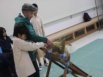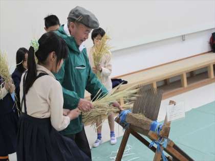 5年生が、稲刈りが終わって、しばらく干していた稲を脱穀しました。脱穀というのは、稲のたばから、モミの粒をとることです。