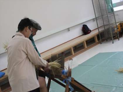 いねのたばを鉄の歯の間に通してもみをとります。