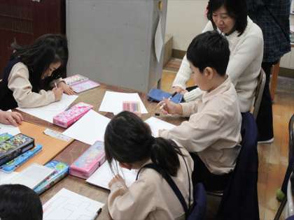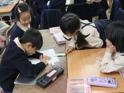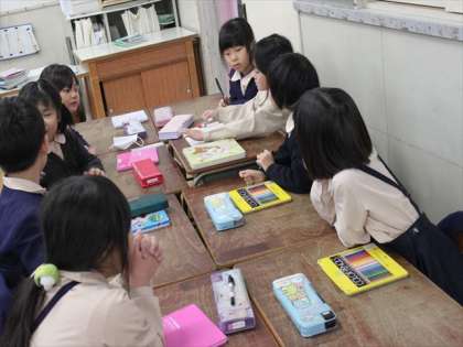 明日21日にお楽しみ会をするそうです。ニコニコの1年生です。グループに分かれて出し物の相談をしています。
