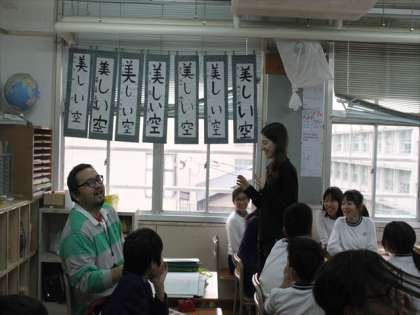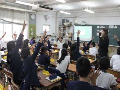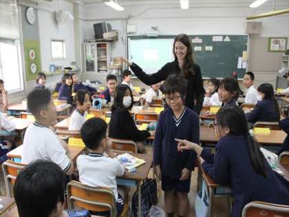 みんなで目を閉じて歩く先生に英語で「まっすぐGo straight」「右に曲がるTurnto the right」「左に曲がる Turn to the left」などで、教えるのです。