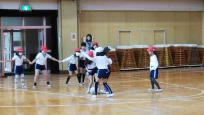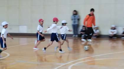 ゴールは、ふつうハンドボールのゴールのようなものですが、今回はコーンからコーンで10mぐらいあります。ゴールキーパーは、試合に出ていない人が手をつないで守ります。