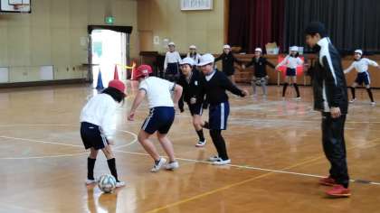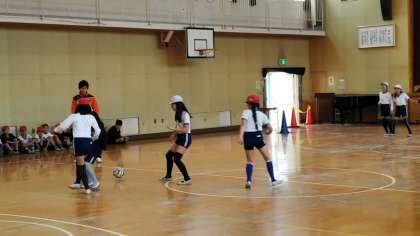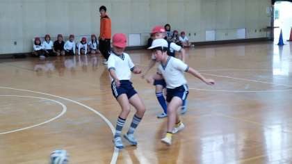 4年生もフットサルのゲームを楽しみました。フットサルがサッカーと違うところは、コートが狭いこと、ボールが弾まないこと、試合の人数が、5対5等です。