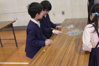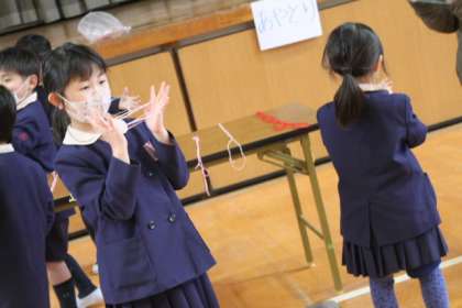 1年の学習参観は、講堂で生活科の「むかしあそび体験」でした。梅南地区、津守地区のみなさんをゲストティーチャーとしてお迎えし、けん玉、お手玉、あやとり、こままわし、おはじき、べったんを教えていただきました。