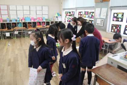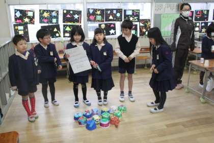2年生の学習参観の様子です。教室で生活科「おもちゃランド」をしました。「ぴょんうさぎ」「さかなつり」「ころころころん」「ぱっちんかえる」「とことこかめ」「ロケットポン」など、手作りおもちゃで、ていねいに説明をして楽しませてくれました。