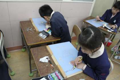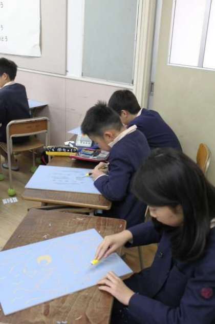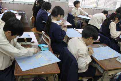 彫刻刀を使っての作業です。題材名は「いろいろな魚」だそうです。黒にする部分と白にする部分を考えるのが難しいです。