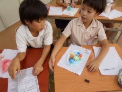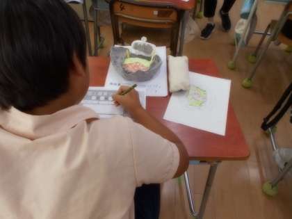 粘土で作った作品の鑑賞を行いました。子どもたちは、友だちのよかったところや工夫を積極的に見つけて鑑賞カードに書くことができました。