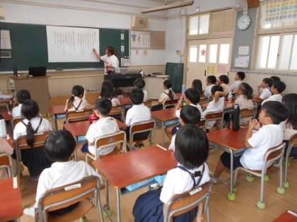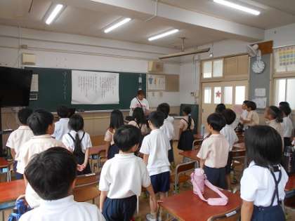 10月に行う平和集会の中で全校児童が歌う曲「あおいそらは」の歌唱を高学年の音楽担当の先生に教わりました。1フレーズずつ何度も歌う練習をし、1曲歌うことができました。集会まで練習を重ねて、素敵に歌えるしたいとおもいます。