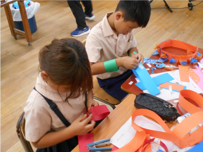 画用紙を丸めてわっかを作り、自分のなりたいものにへんしんします。