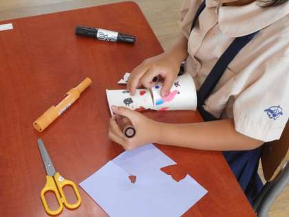 マジックペンで色を塗ったり、絵を描いたり、折り紙で飾りをつけたりと個性豊かな作品が出来上がりました。出来上がった作品で友だちと遊んでいる様子も見られ、楽しく作品作りができました。
