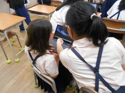 1年生に新しい学習者用端末(パソコン)が届きました。1年生にとっては初めてのパソコンですので、使い方を6年生と一緒に学びました。