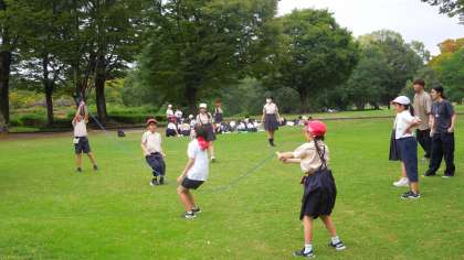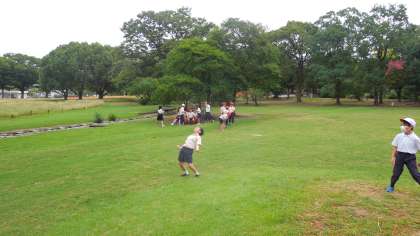 国立民族学博物館の見学中に雨が降り出し、急遽館内での「お弁当&おやつタイム」になってしまいましたが、食べ終わるころには雨は上がり、公園で遊ぶことができました。芝生の上でのんびりくつろいだり、おにごっこや大縄跳びをしたり、友だちと楽しく遊ぶことができました。