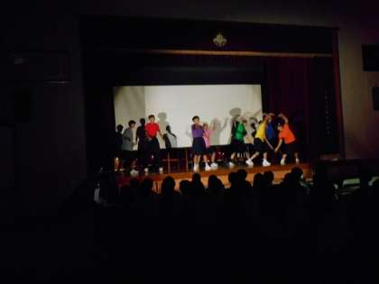 中学3年生の劇を見ました。迫力のあるソーラン節や太鼓の演技を見て6年生は感動していました。