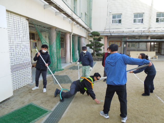 西成警察の方に不審者役をしていただき、児童の安全確保・通報・教職員の連携など実践的に行いました。