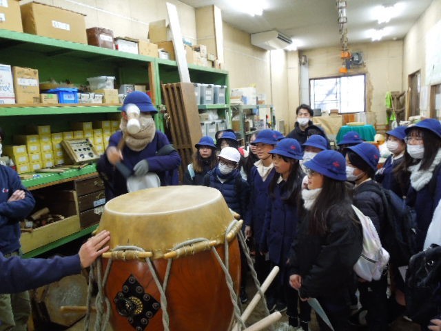 今日は午後から社会見学で「太鼓正」へ行ってきました。「革張り」の工程では、皮をジャッキで伸ばしながら職人さんたちが同じリズムで皮を打つ姿を見て、子どもたちは感動している様子でした。ひとつの和太鼓ができるまでに何年もかかることや、命を無駄にしないこと、失敗を恐れず失敗した理由を自分で考えることの大切さなど、職人さんからたくさんのことを学ぶことができました。